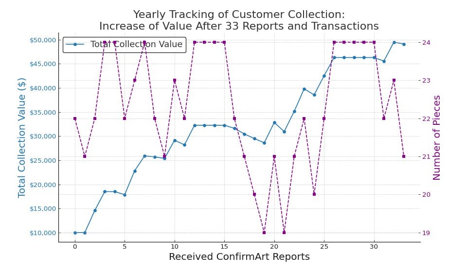 Our tailored reports guide collectors through smart acquisitions and well-timed sales, consistently enhancing the value of their assets. The chart below tracks the success story of a valued client over a year—each report and transaction contributing to an impressive upward trend in the collection’s overall value, while maintaining a curated selection of pieces. Witness the power of expert validation: informed choices, remarkable returns.