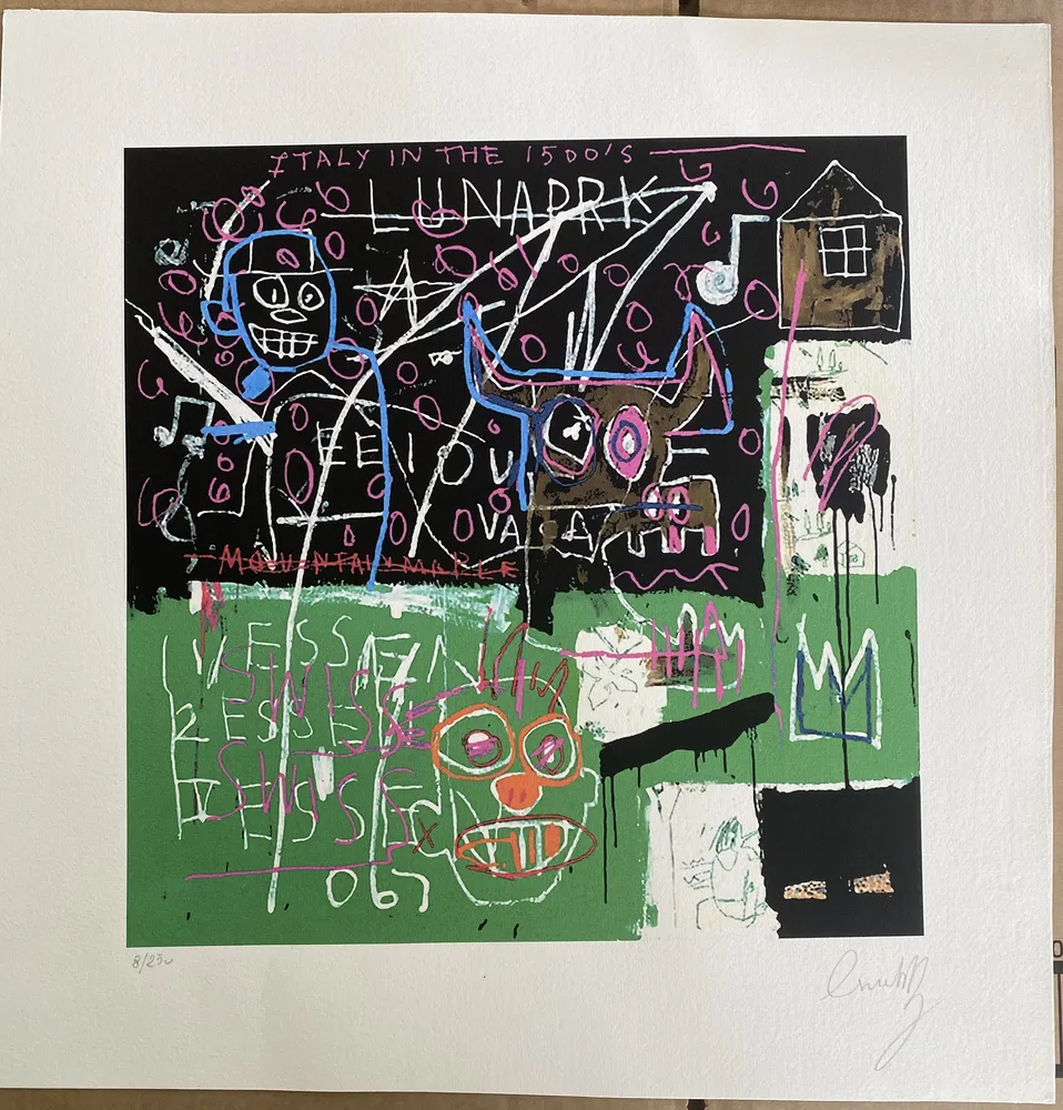 The artwork, titled “LNAPRK” and dated 1982, is a vibrant and chaotic piece characteristic of the iconic style of artist Jean-Michel Basquiat. Created during a pivotal year in Basquiat’s career, the piece showcases a dense composition of cryptic texts, abstracted figures, and bold colors. The use of a crown motif, dark hues contrasted with vivid colors, and historical references are all typical of Basquiat’s work from this period. The print, on wove paper, captures Basquiat’s explosive energy but lacks the exposed stretcher corners and signature style commonly found in his authentic works from 1982. The estimated value of the print is 100€.