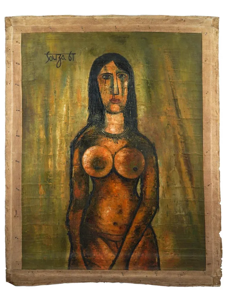 This painting by Francis Newton Souza, also known as F.N. Souza, is an oil on canvas that depicts a female nude. The artwork, titled “Nude Lady,” showcases Souza’s distinctive style, characterized by bold lines, raw emotion, and expressive forms. The female figure is rendered with a primitive yet modernist approach, reflecting Souza’s exploration of human form and his departure from traditional representations. The background features textured, earthy tones that contrast with the figure’s dark hair and outlined features.