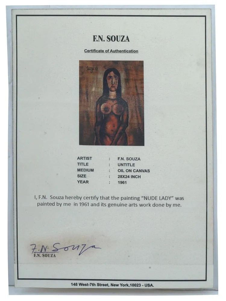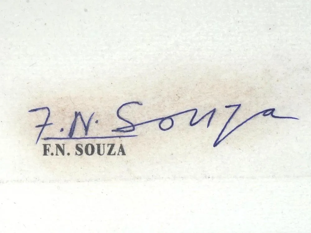 Given the analysis indicating that the signature on the artwork “Nude Lady” is not authentic and therefore, it is not an original work by Francis Newton Souza, the value of the piece is significantly affected. Authentic Souza works are highly valued due to his prominence as a pioneer of Indian Modern art. However, as this piece is determined to be non-authentic, its market value would be considerably lower. It may still hold some value as a decorative art piece or for those interested in mid-century modernist graphic art, but it should not be priced or valued at the same level as a genuine Souza artwork.