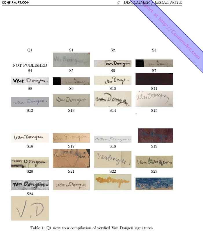 Notably, the analysis of the signature on the artwork, labeled as Q1, highlights significant inconsistencies when compared to authenticated signatures of the artist.